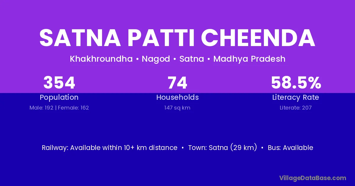 Satna Patti Cheenda village has a total population of 354 people, of which 192 are males and 162 are females.