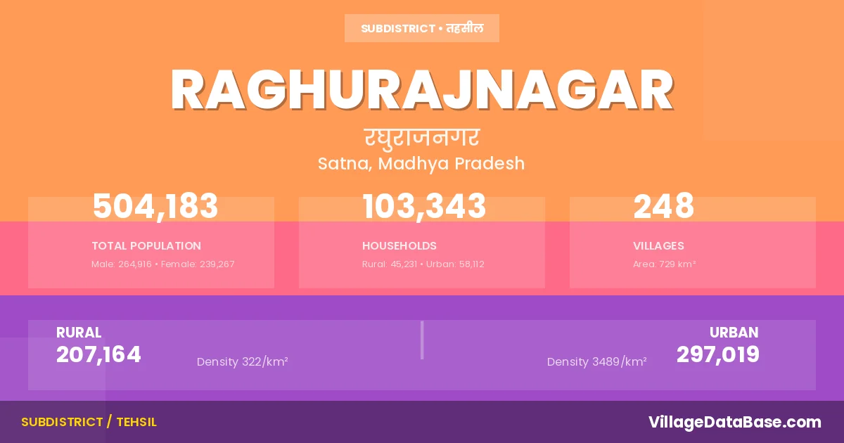 According to the 2011 census The total area of Raghurajnagar Tehsil is 729 km², with a population of 504183 people. The population density is 691 inhabitants per square kilometre, and there are approximately 103343 houses in the sub district.