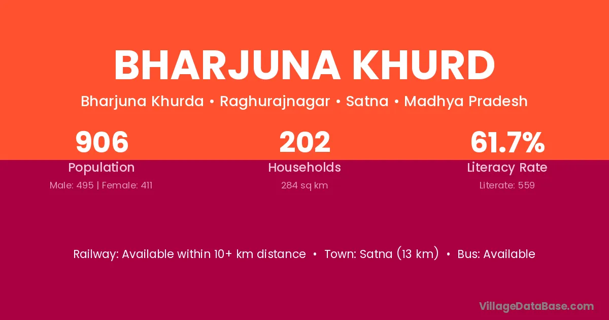 Satna (13 km) is the nearest town to Bharjuna Khurd village for major economic activities and is located approximately 13 km away.