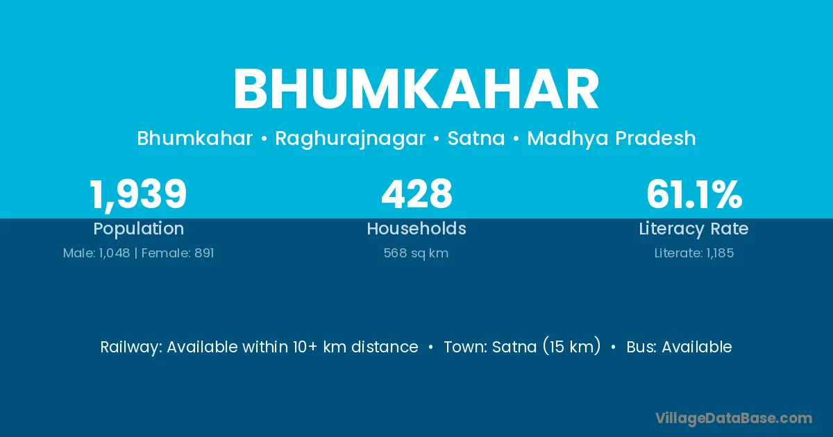 Satna (15 km) is the nearest town to Bhumkahar village for major economic activities and is located approximately 15 km away.