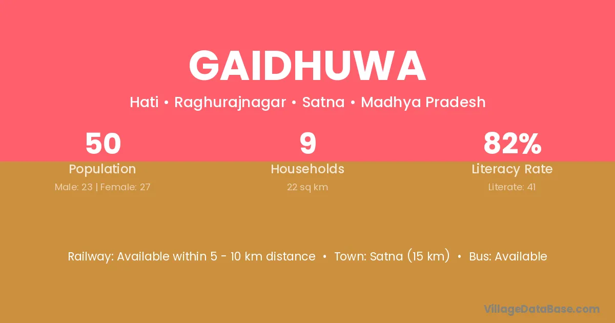 Satna (15 km) is the nearest town to Gaidhuwa village for major economic activities and is located approximately 15 km away.