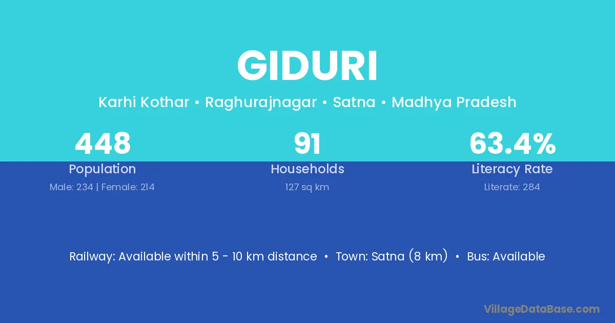 Satna (8 km) is the nearest town to Giduri village for major economic activities and is located approximately 8 km away.