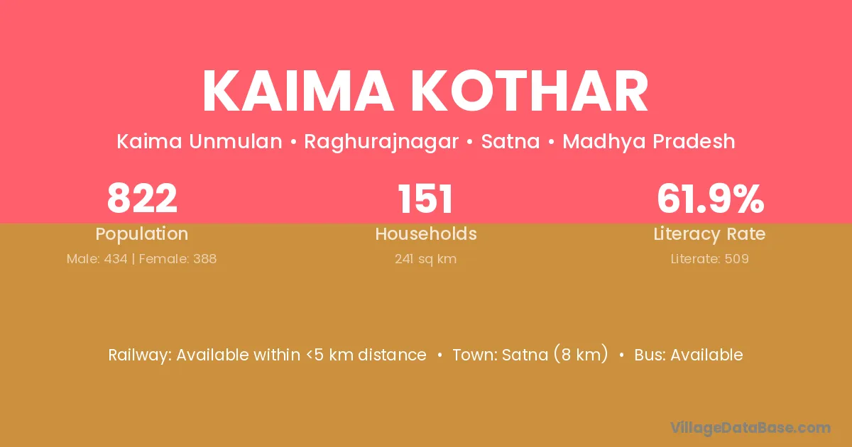 Satna (8 km) is the nearest town to Kaima Kothar village for major economic activities and is located approximately 8 km away.