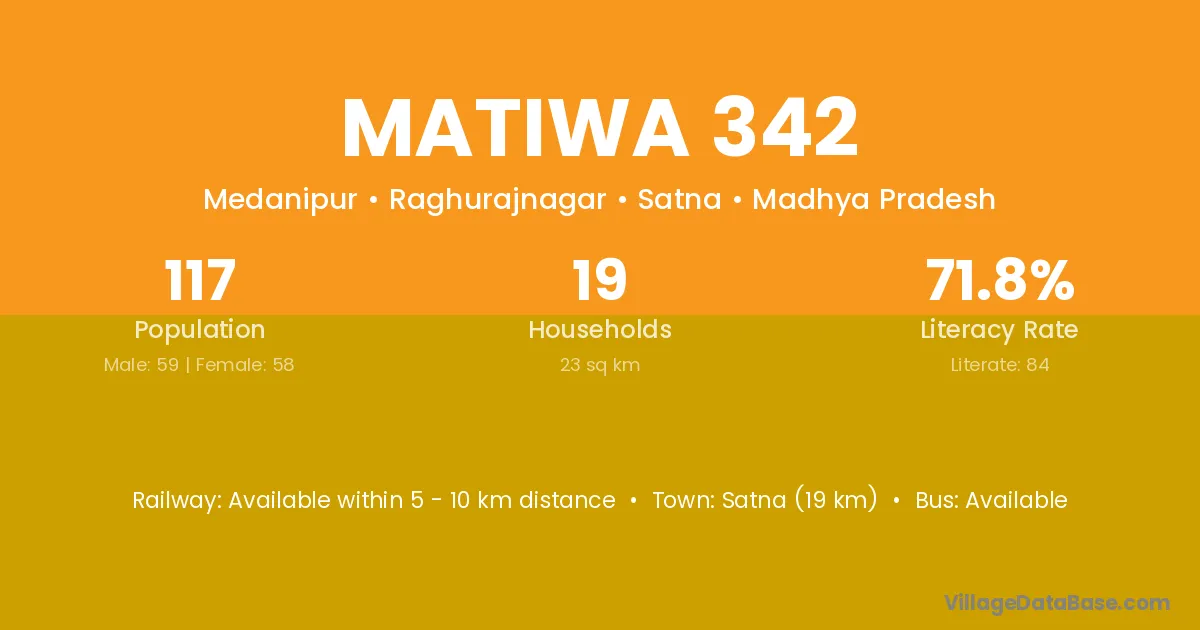 Matiwa 342 village has a total population of 117 people, of which 59 are males and 58 are females.