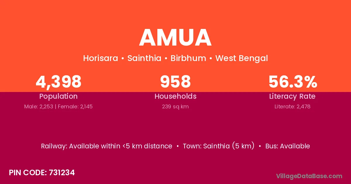 The literacy rate of Amua village is 58.63%. Male literacy stands at 65.22% and female literacy at 52.57%.