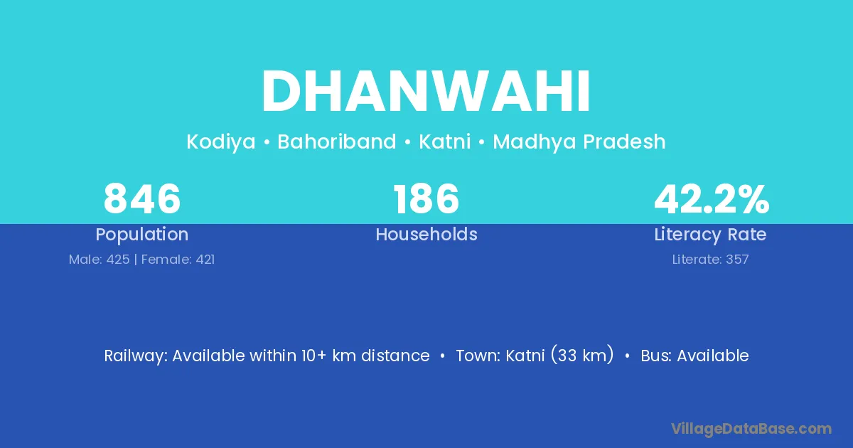 Dhanwahi village has a total population of 857 people, of which 439 are males and 418 are females.