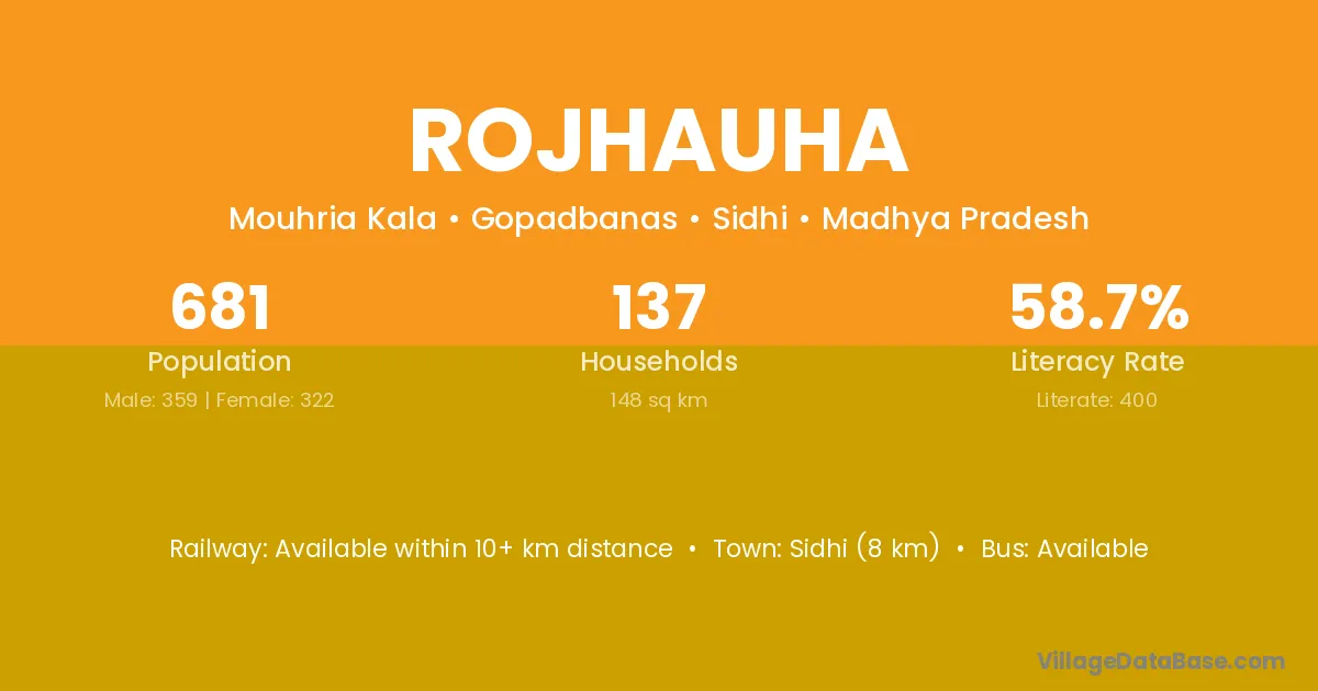 The literacy rate of Rojhauha village is 53.98%. Male literacy stands at 65.56% and female literacy at 41.86%.