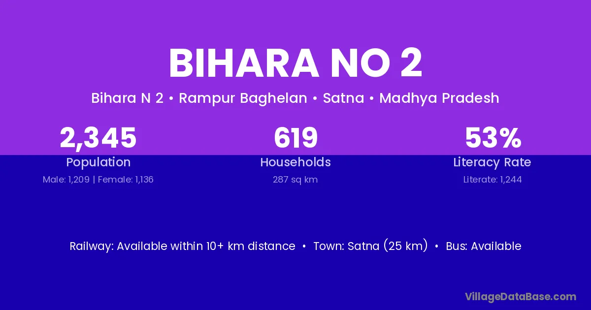 Satna (25 km) is the nearest town to Bihara No 2 village for major economic activities and is located approximately 25 km away.