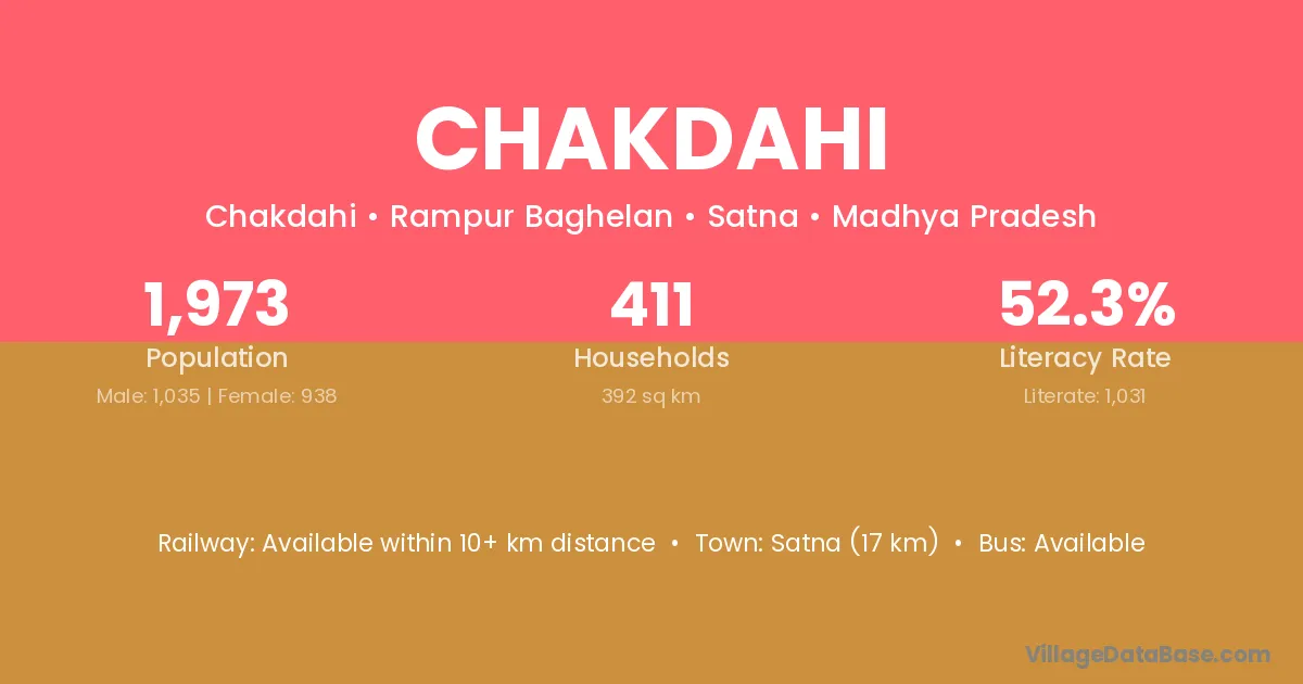 Satna (17 km) is the nearest town to Chakdahi village for major economic activities and is located approximately 17 km away.