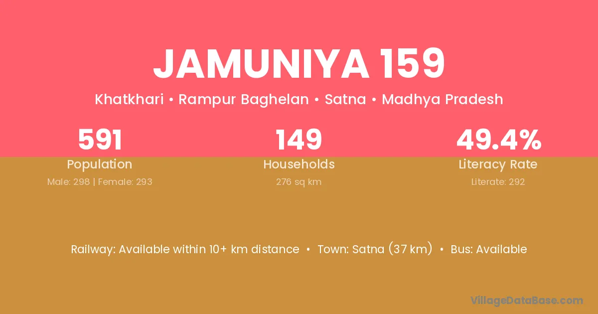 Satna (37 km) is the nearest town to Jamuniya 159 village for major economic activities and is located approximately 37 km away.