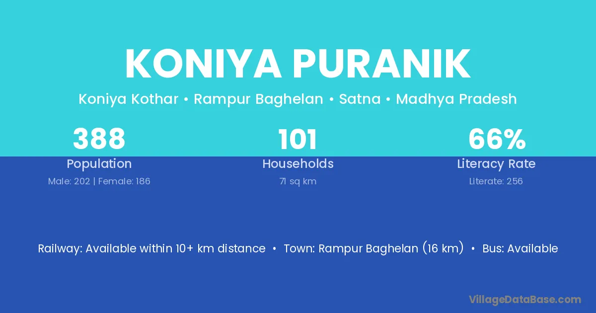Koniya Puranik village has a total population of 388 people, of which 202 are males and 186 are females.