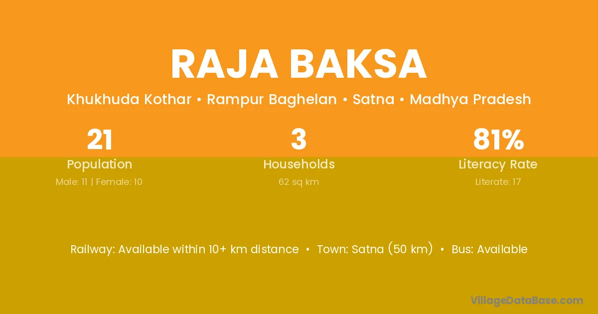 Satna (50 km) is the nearest town to Raja Baksa village for major economic activities and is located approximately 50 km away.