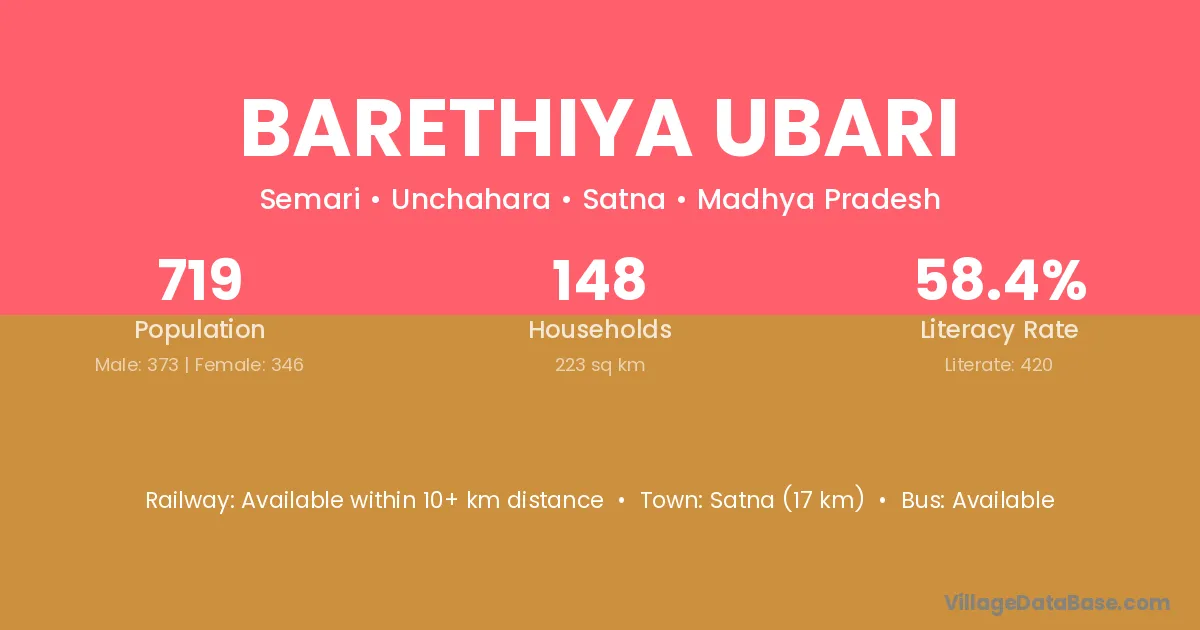 Satna (17 km) is the nearest town to Barethiya Ubari village for major economic activities and is located approximately 17 km away.