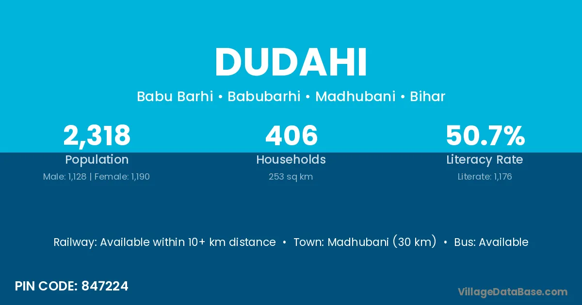 Unchehara (16 km) is the nearest town to Dudahi village for major economic activities and is located approximately 16 km away.