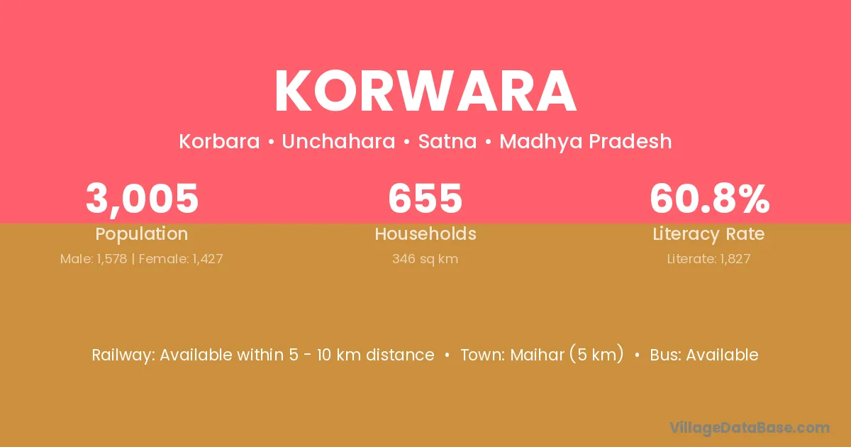 Maihar (5 km) is the nearest town to Korwara village for major economic activities and is located approximately 5 km away.