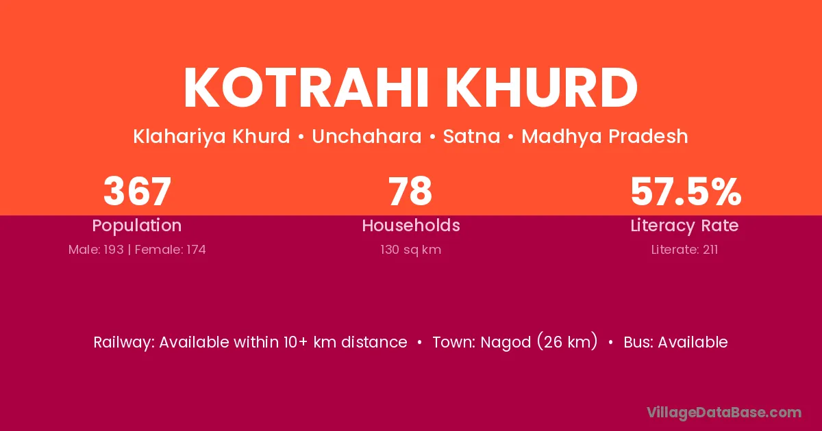 Nagod (26 km) is the nearest town to Kotrahi Khurd village for major economic activities and is located approximately 26 km away.