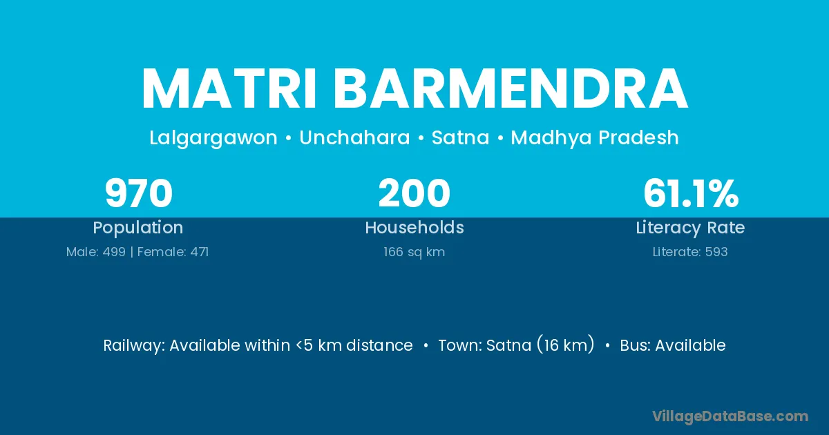 Satna (16 km) is the nearest town to Matri Barmendra village for major economic activities and is located approximately 16 km away.