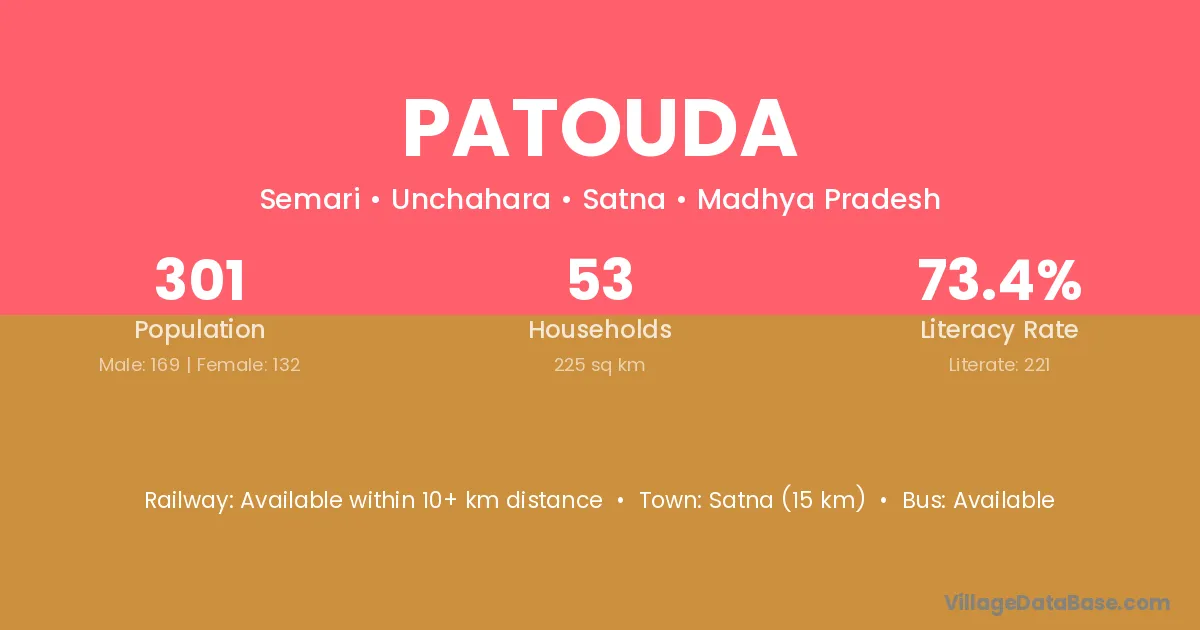Satna (15 km) is the nearest town to Patouda village for major economic activities and is located approximately 15 km away.