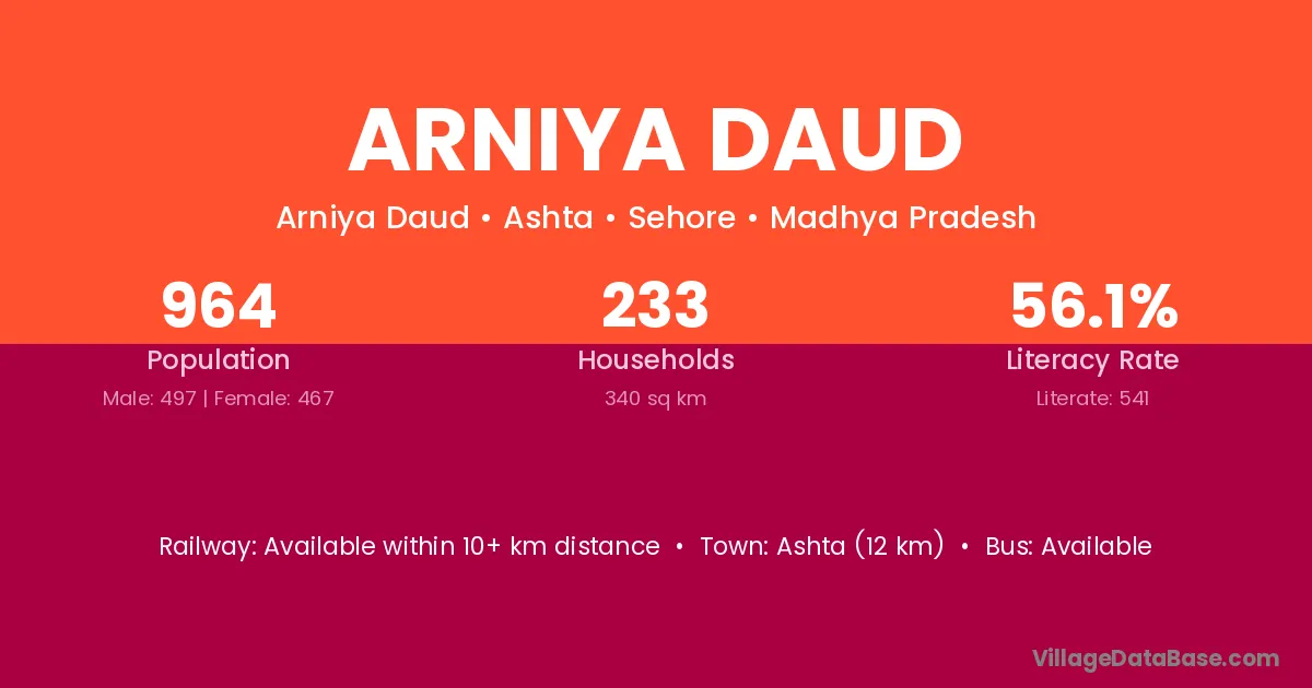 Ashta (12 km) is the nearest town to Arniya Daud village for major economic activities and is located approximately 12 km away.