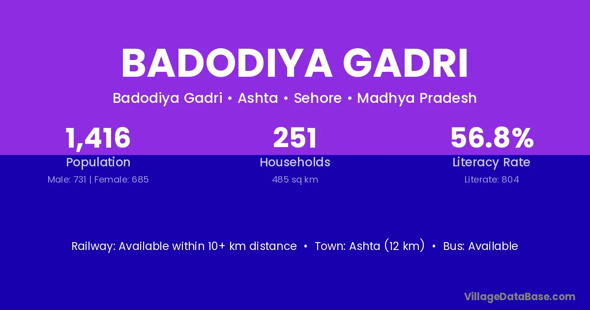 Ashta (12 km) is the nearest town to Badodiya Gadri village for major economic activities and is located approximately 12 km away.
