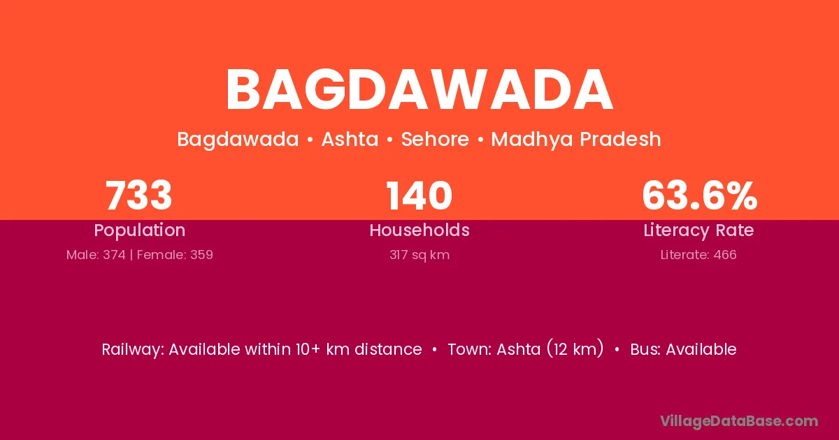 Ashta (12 km) is the nearest town to Bagdawada village for major economic activities and is located approximately 12 km away.