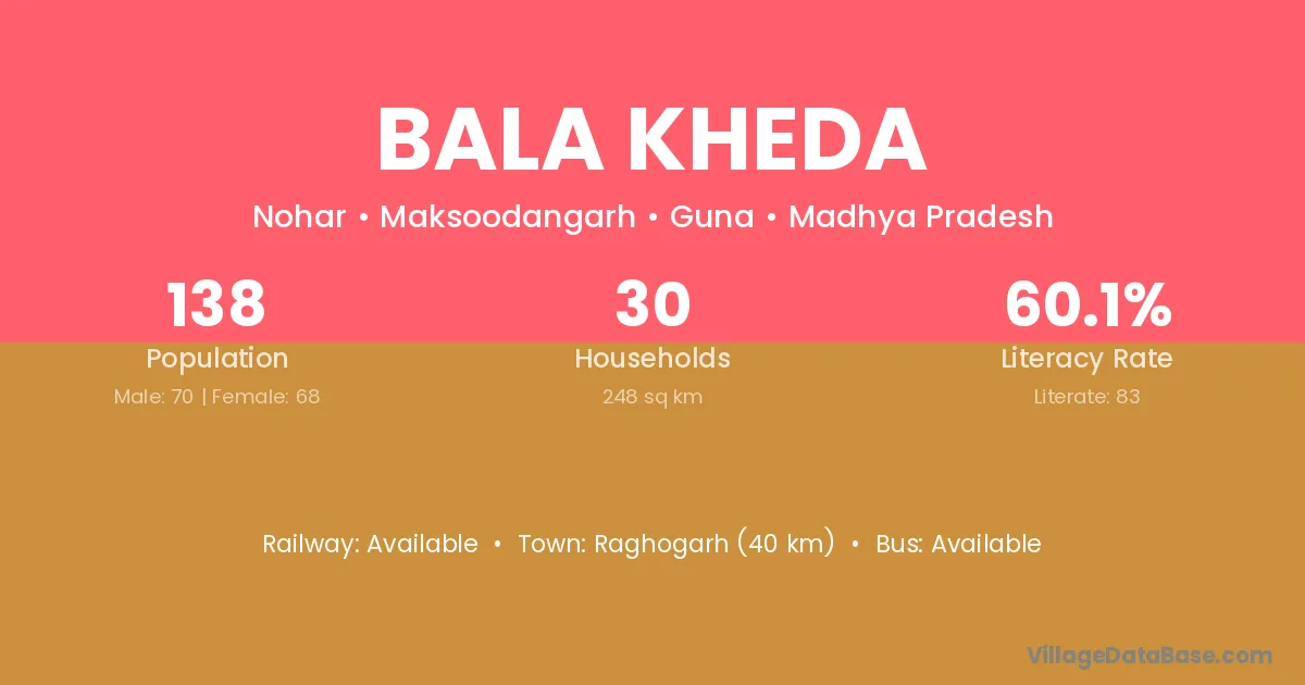 Ashta (17 km) is the nearest town to Bala Kheda village for major economic activities and is located approximately 17 km away.