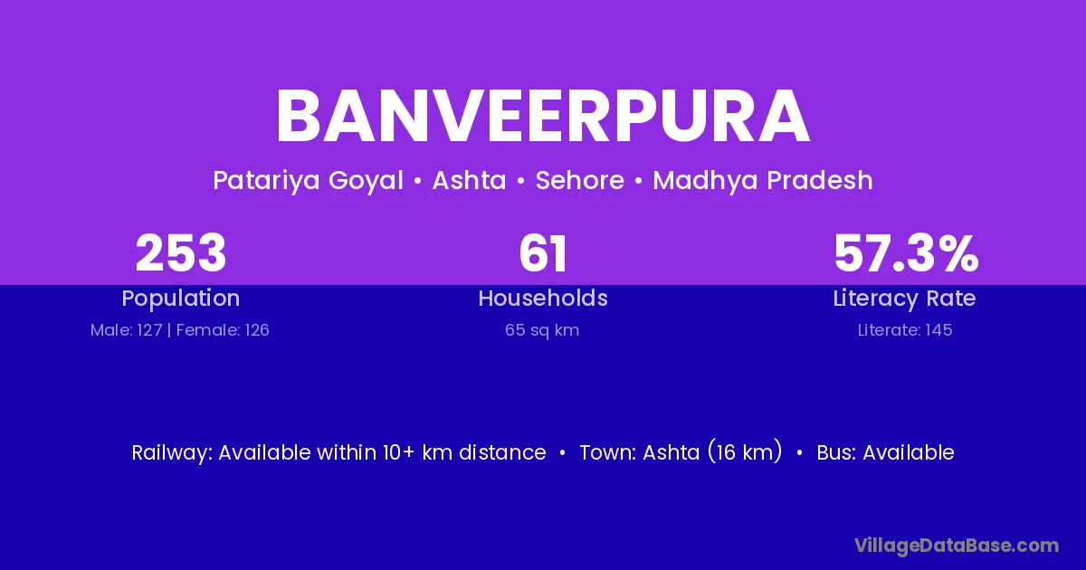 Ashta (16 km) is the nearest town to Banveerpura village for major economic activities and is located approximately 16 km away.