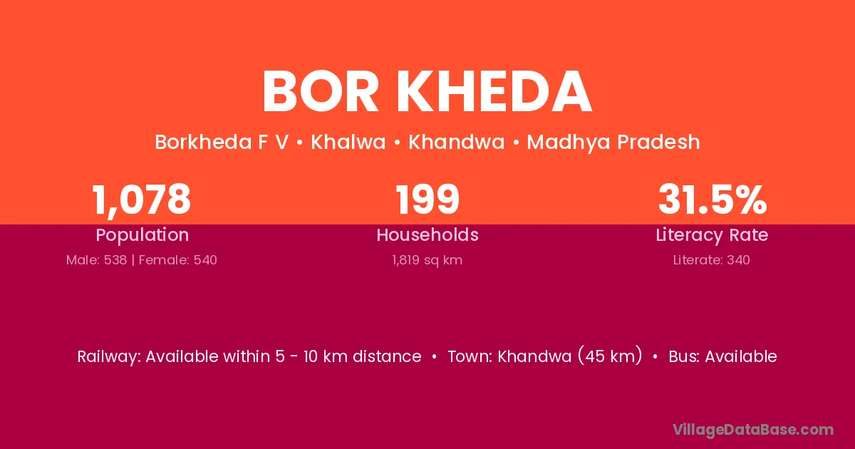 Kothri (7 km) is the nearest town to Bor Kheda village for major economic activities and is located approximately 7 km away.