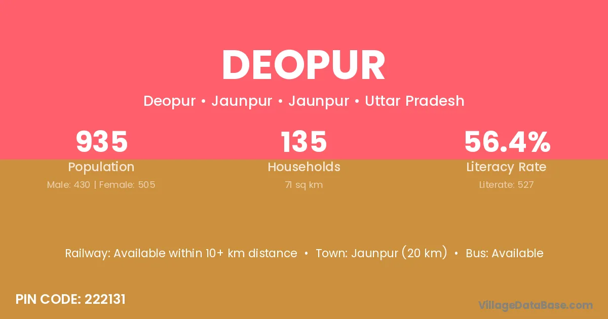 The literacy rate of Deopur village is 13.75%. Male literacy stands at 18.99% and female literacy at 8.64%.