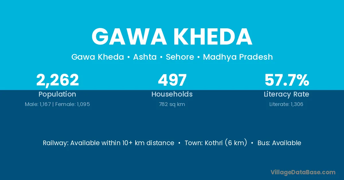Gawa Kheda village has a total population of 2,262 people, of which 1,167 are males and 1,095 are females.