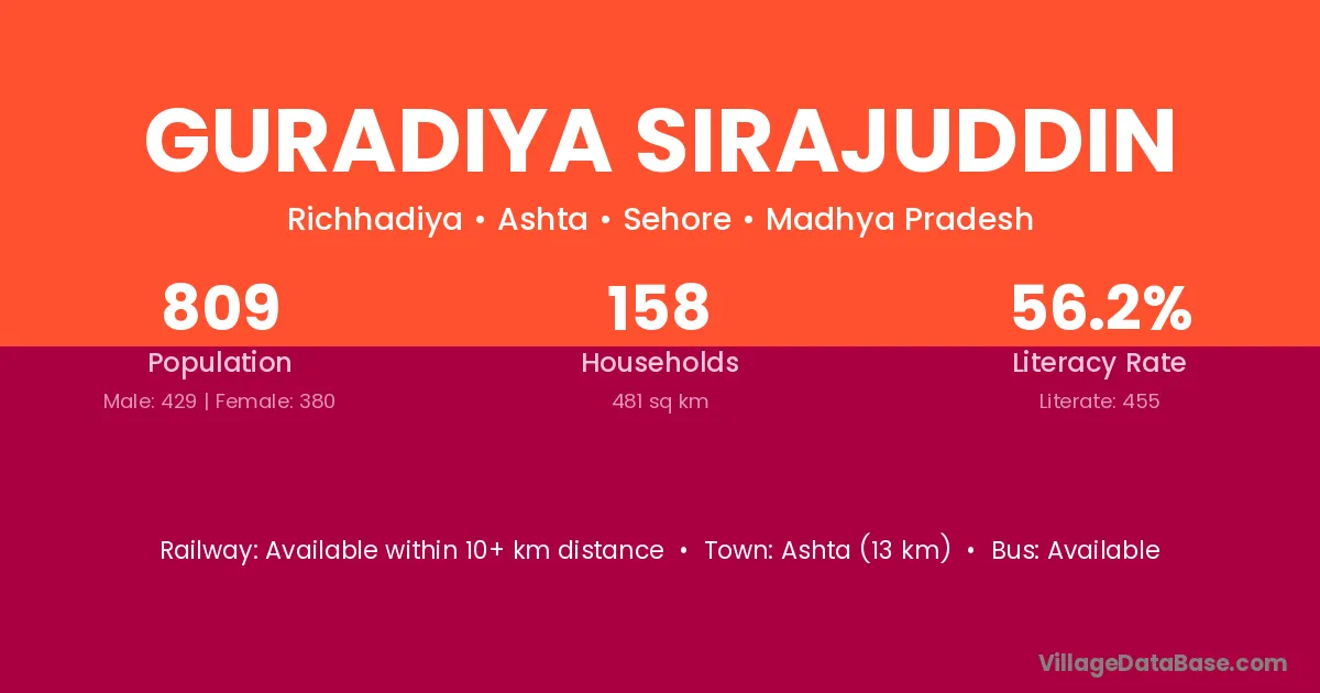 Ashta (13 km) is the nearest town to Guradiya Sirajuddin village for major economic activities and is located approximately 13 km away.