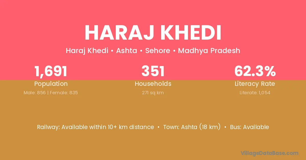 Ashta (18 km) is the nearest town to Haraj Khedi village for major economic activities and is located approximately 18 km away.