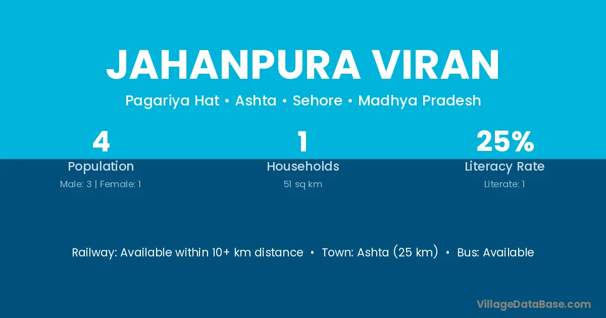 Ashta (25 km) is the nearest town to Jahanpura Viran village for major economic activities and is located approximately 25 km away.