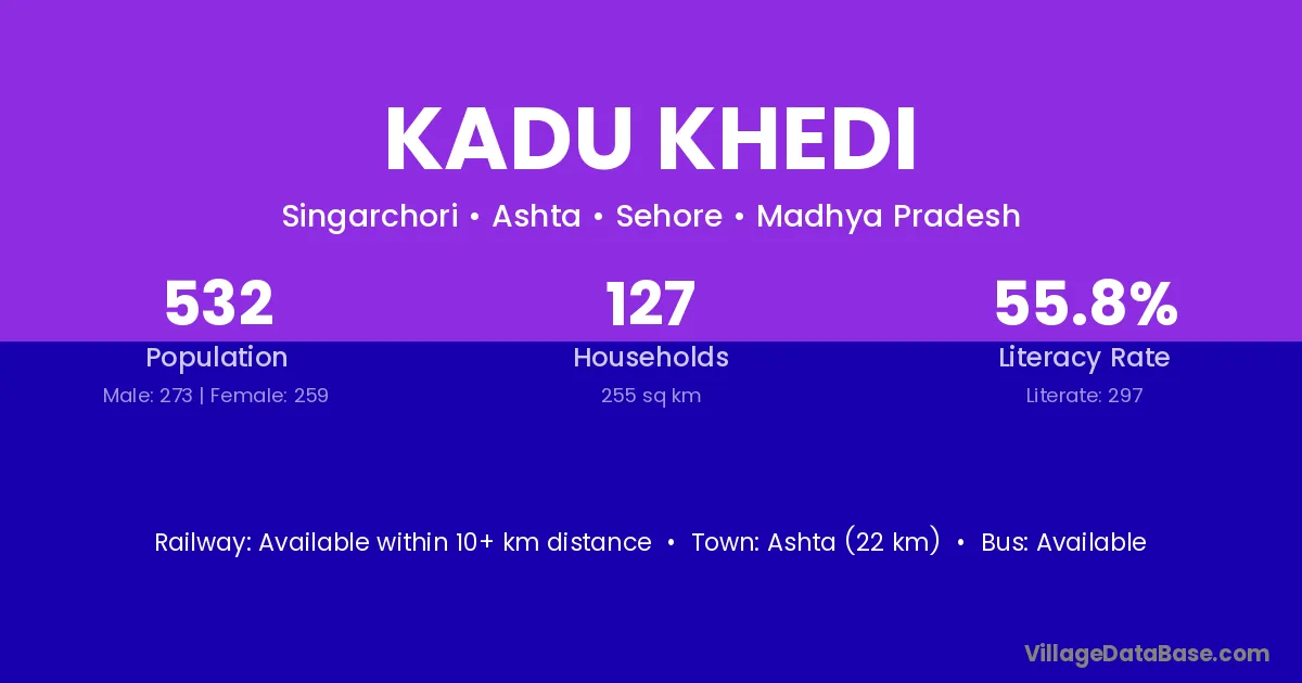 Ashta (22 km) is the nearest town to Kadu Khedi village for major economic activities and is located approximately 22 km away.