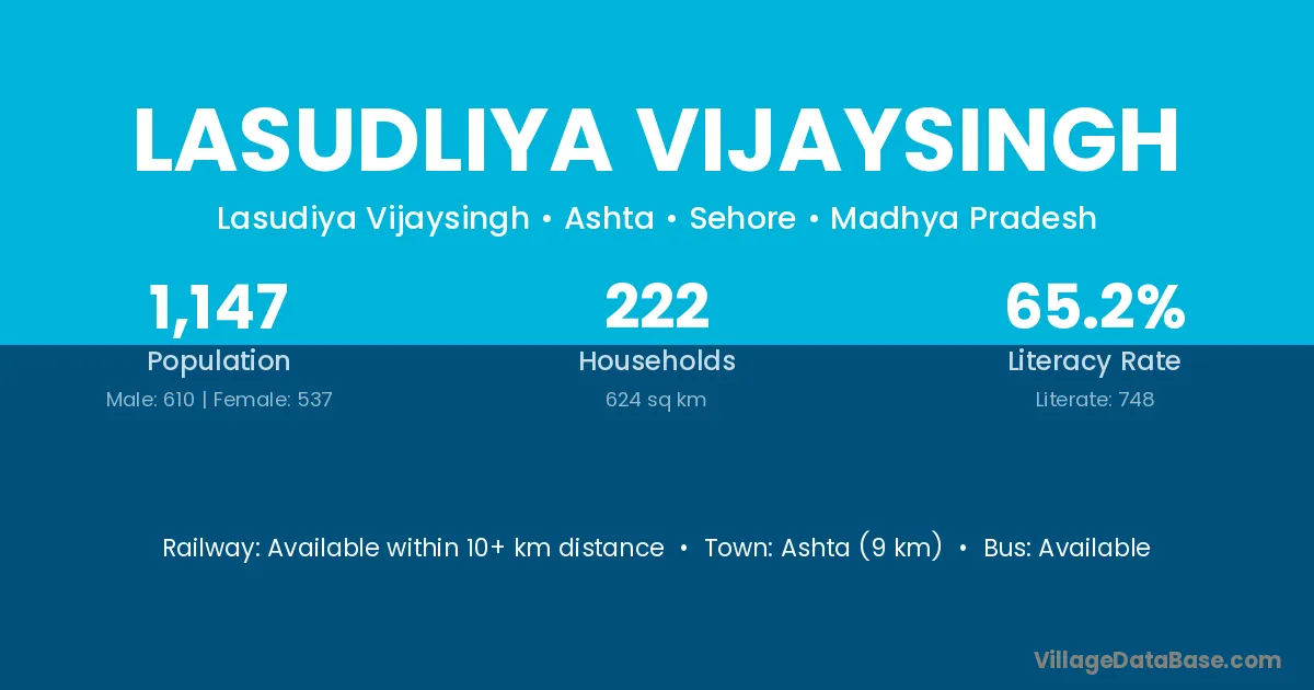 Ashta (9 km) is the nearest town to Lasudliya Vijaysingh village for major economic activities and is located approximately 9 km away.