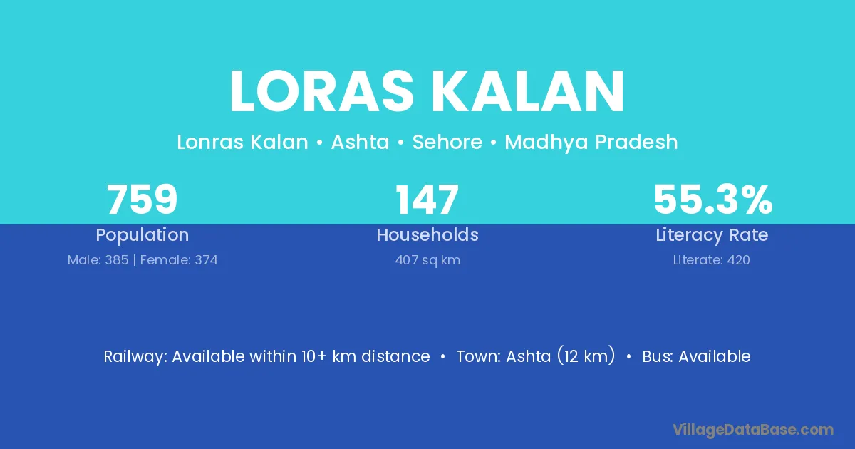 Ashta (12 km) is the nearest town to Loras Kalan village for major economic activities and is located approximately 12 km away.