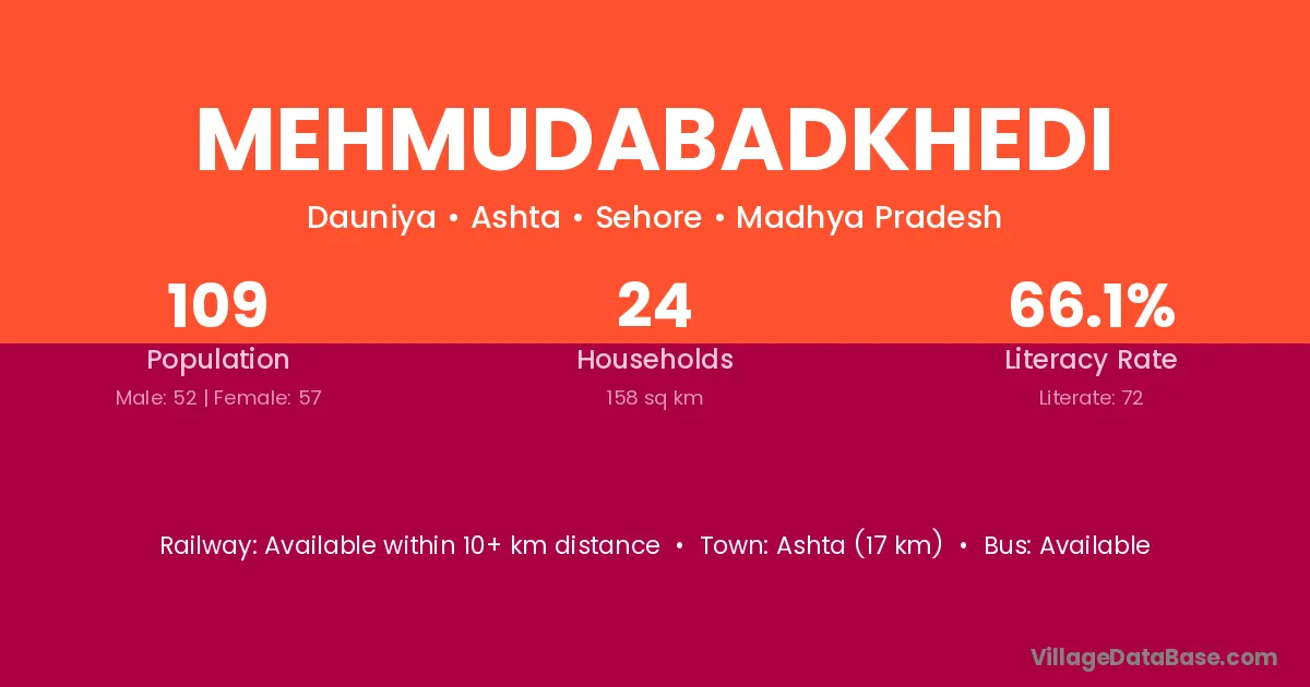 Mehmudabadkhedi village has a total population of 109 people, of which 52 are males and 57 are females.