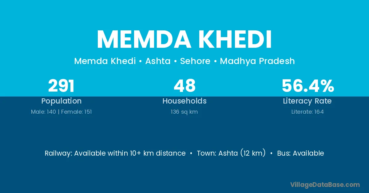 Ashta (12 km) is the nearest town to Memda Khedi village for major economic activities and is located approximately 12 km away.