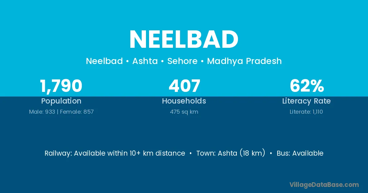 Ashta (18 km) is the nearest town to Neelbad village for major economic activities and is located approximately 18 km away.