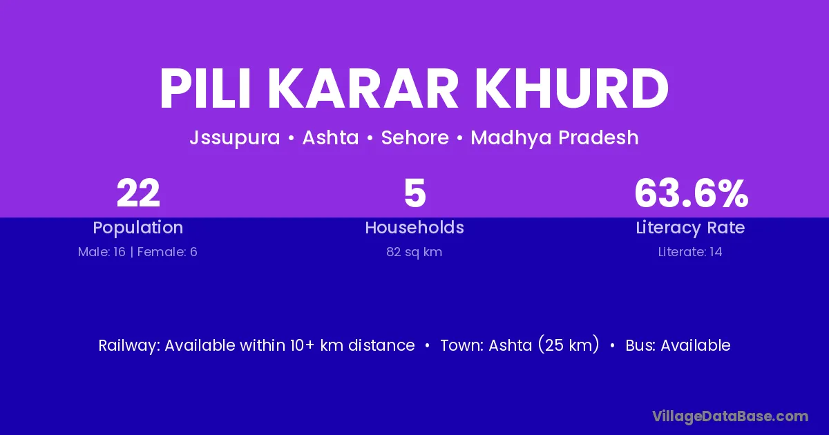Ashta (25 km) is the nearest town to Pili Karar Khurd village for major economic activities and is located approximately 25 km away.