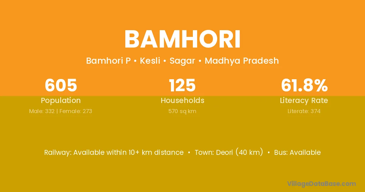 Budni (56 km) is the nearest town to Bamhori village for major economic activities and is located approximately 56 km away.