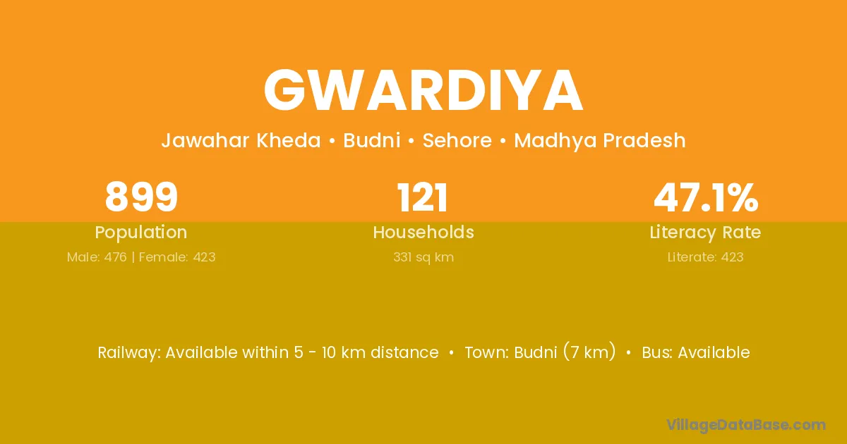 Budni (7 km) is the nearest town to Gwardiya village for major economic activities and is located approximately 7 km away.