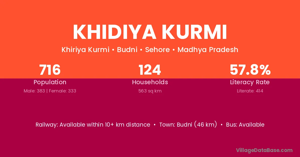 Budni (46 km) is the nearest town to Khidiya Kurmi village for major economic activities and is located approximately 46 km away.