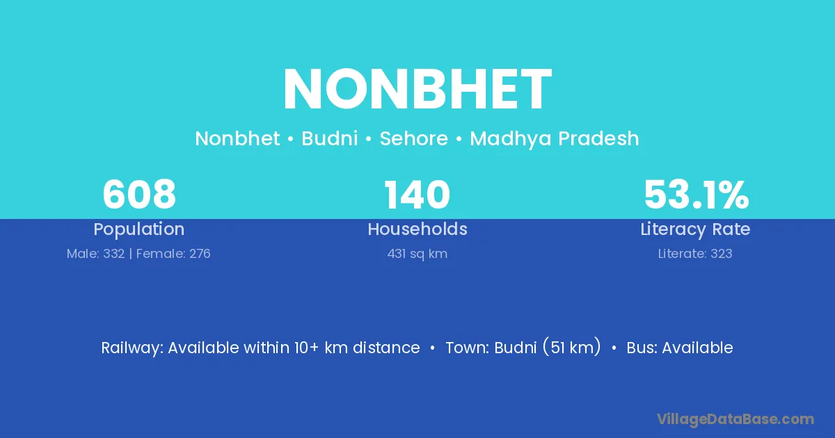 Budni (51 km) is the nearest town to Nonbhet village for major economic activities and is located approximately 51 km away.