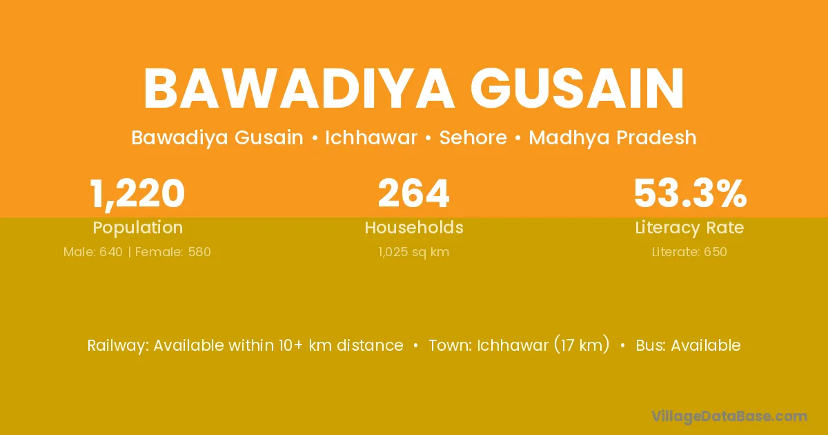 Ichhawar (17 km) is the nearest town to Bawadiya Gusain village for major economic activities and is located approximately 17 km away.