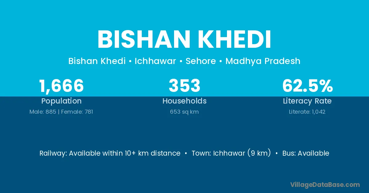 Ichhawar (9 km) is the nearest town to Bishan Khedi village for major economic activities and is located approximately 9 km away.