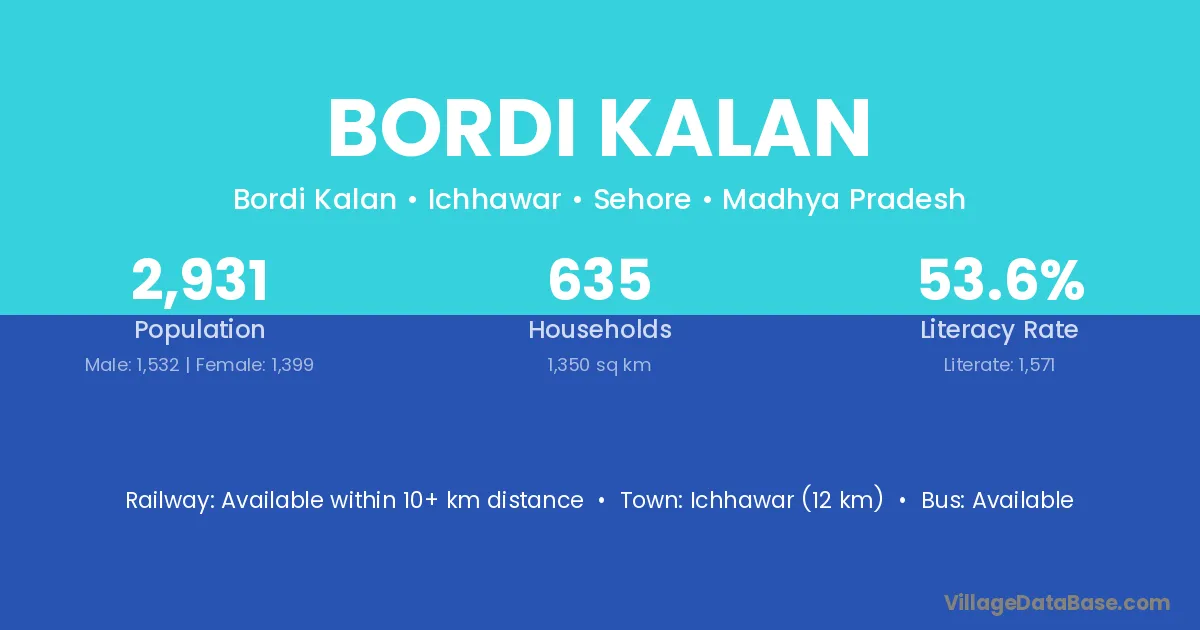 Ichhawar (12 km) is the nearest town to Bordi Kalan village for major economic activities and is located approximately 12 km away.