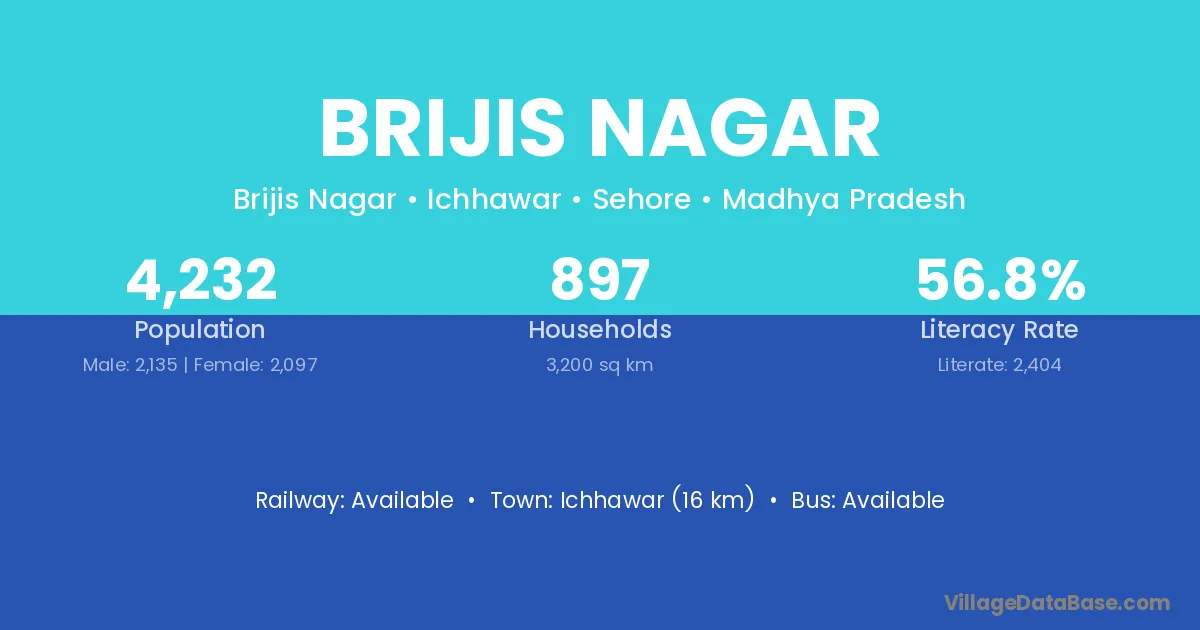 Ichhawar (16 km) is the nearest town to Brijis Nagar village for major economic activities and is located approximately 16 km away.