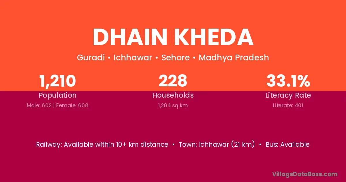 Ichhawar (21 km) is the nearest town to Dhain Kheda village for major economic activities and is located approximately 21 km away.