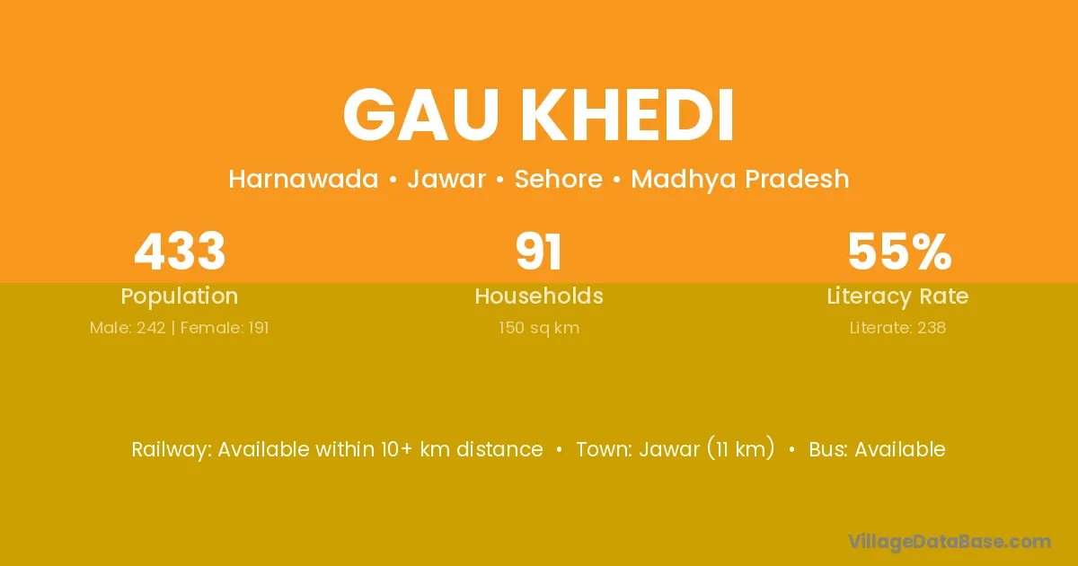 The literacy rate of Gau Khedi village is 51.82%. Male literacy stands at 64.47% and female literacy at 37.86%.
